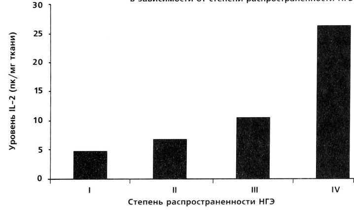 При определении содержания IL-2 показано его достоверное повышение, зависисящее от степени тяжести заболевания (минимальное значение при I степени, максимальное при IV степени НГЭ). Так, значение IL-2 при НГЭ I степени составило 4,73 пг/мг, при НГЭ II степени -6,8 пг/мг, при НГЭ III степени - 10,47 пг/мг и при НГЭ IV степени - 26,3 пг/мг. Прогрессивное возрастание продукции IL-2 в зависимости от степени распространенности НГЭ можно расценивать как защитную реакцию иммунной системы, так как основной биологический эффект IL-2 заключается в стимуляции лимфоцитов, обладающих цитотоксической активностью, усиление продукции IFN-γ и противоопухолевой активности.