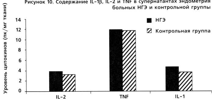 Существенных различий в содержании IL-1(3, IL-2 и TNF в супернатантах эндометрия больных НГЭ и здоровых женщин отмечено не было (рис. 10).