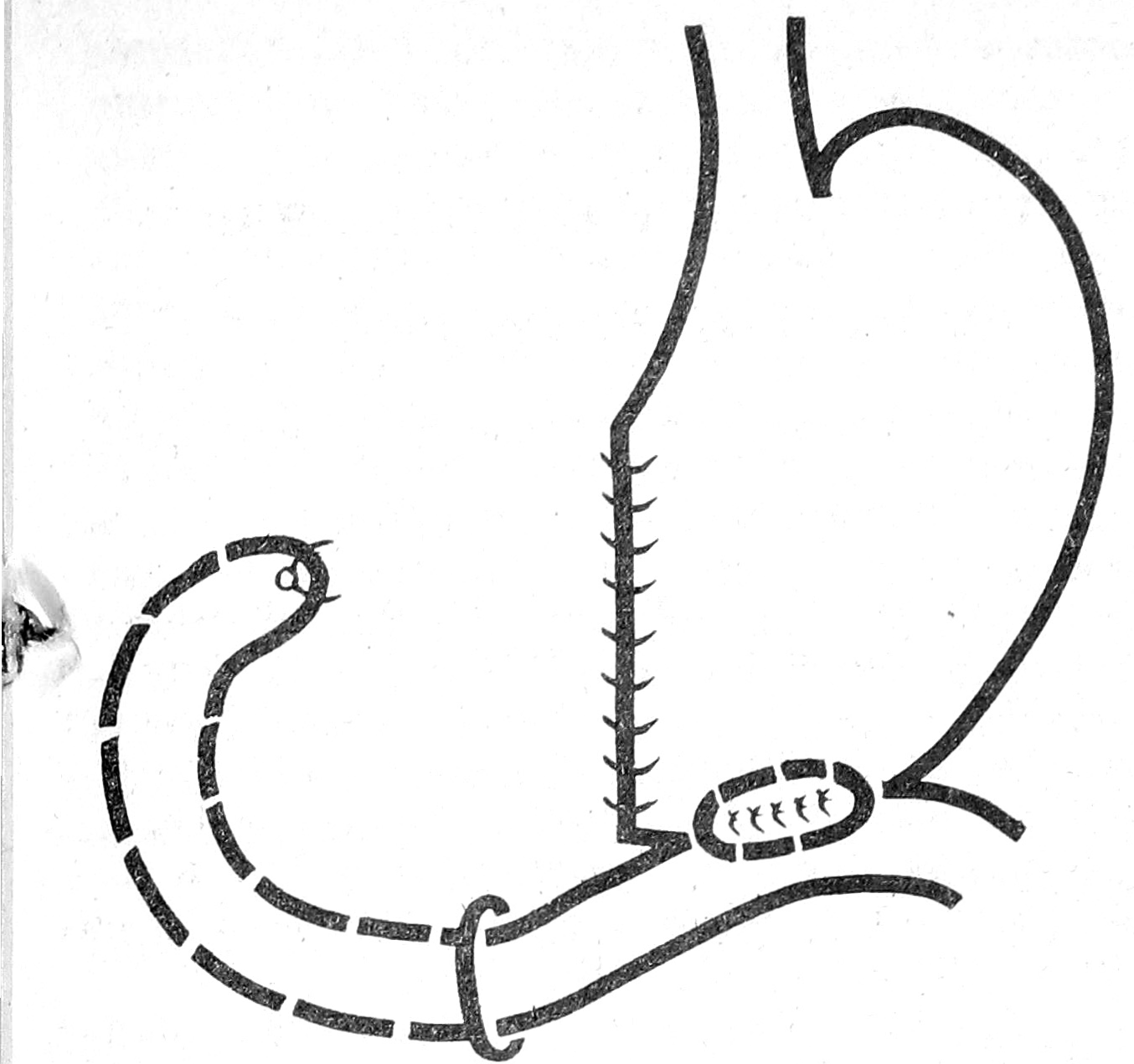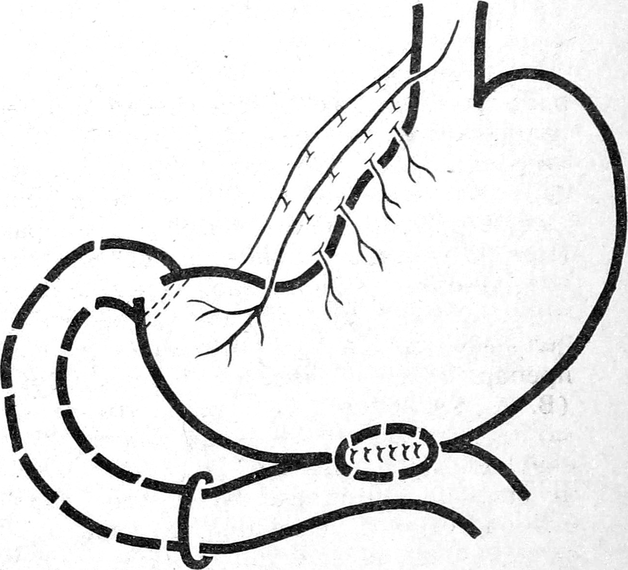 Дальнейшей разработкой в этом направлении явилась оригинальная методика операции по Б. Л. Еляшевичу. Принципиальное ее отличие от других прототипов заключается в том, что гастроэнтероанастомоз на предельно короткой петле формируется анизоперистальтически между большой кривизной культи желудка и флексурным отделом тощей кишки после рассечения связки Трейца. Преимущества такой операции заключаются в следующем: