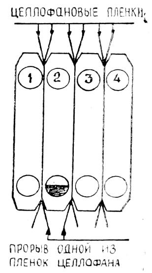 На 100 гемодиализов, проведенных в Казанском почечном центре, было 7 случаев прорыва целлофановой пленки. В трех из них гемодиализ прекращали и аппарат готовили к работе заново. В последующем мы разработали более простой способ, который состоит в выключении из системы кровообращения той пластины диализатора, где произошел прорыв целлофановой пленки. С этой целью отключают оба насоса аппарата и определяют место прорыва целлофана, что сделать несложно, так как поврежденная пластина резко выделяется среди остальных, в основном канале ее значительно больше крови, чем в смежных (рис. 1).