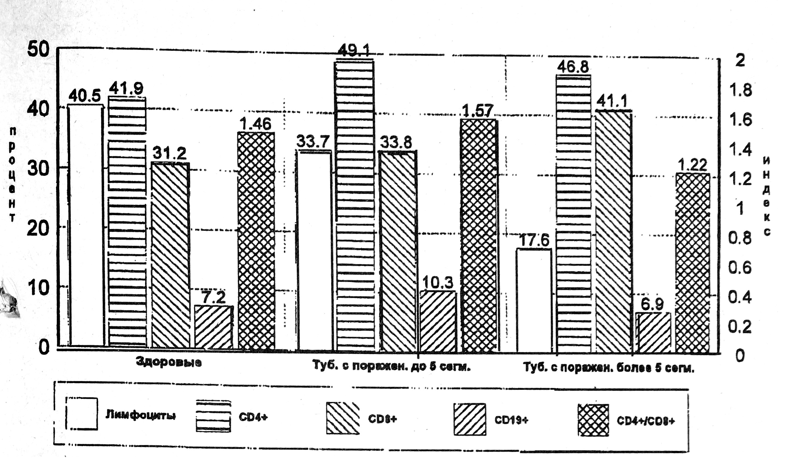 С этой целью нами исследован иммунный статус двух репрезентативных групп. 1-ю группу составили 58 больных инфильтративным туберкулезом легких в фазе распада и обсеменения, БК+, с преобладанием экссудативно-альтеративного компонентов специфического воспаления, 2-ю — 30 здоровых доноров.