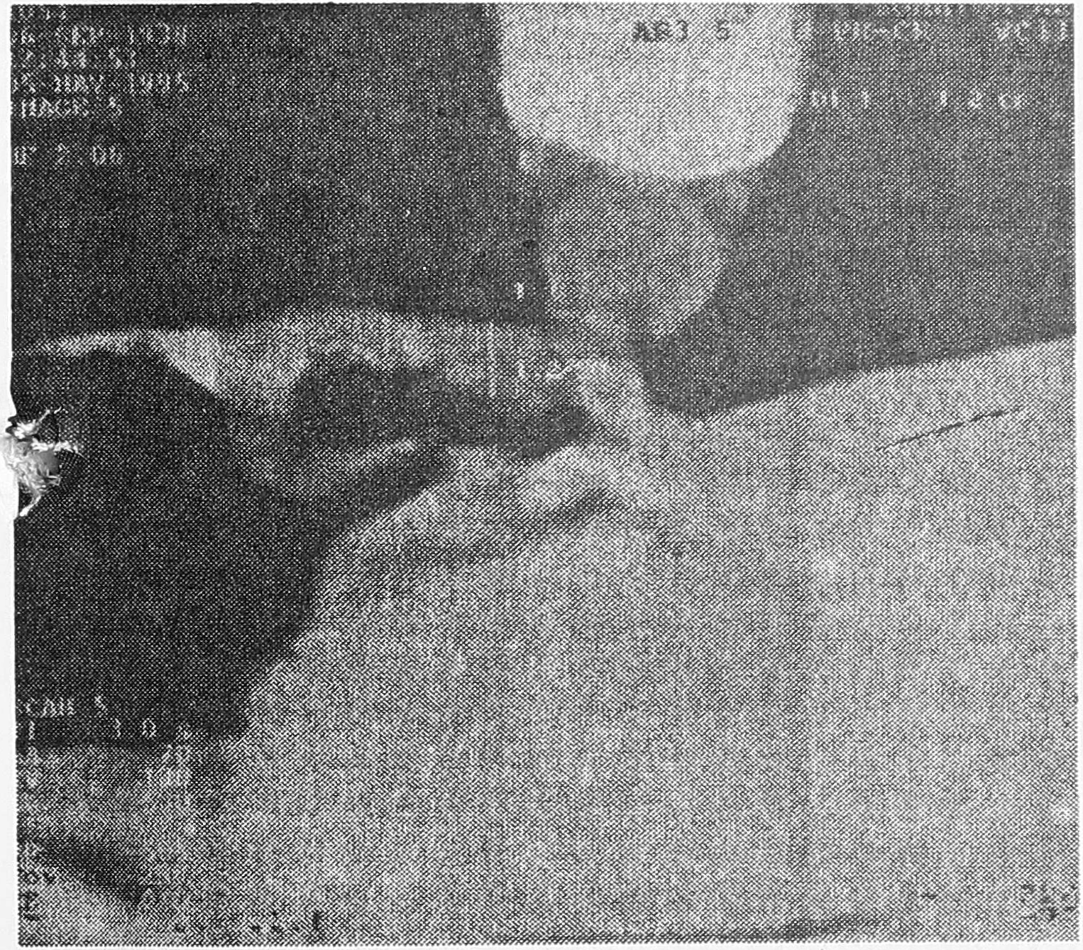 Рис. 5. Больной М., 70 лет. Малый эндофитный рак препилорического отдела желудка. Утолщение до 1,4 см (отмечено на снимке).