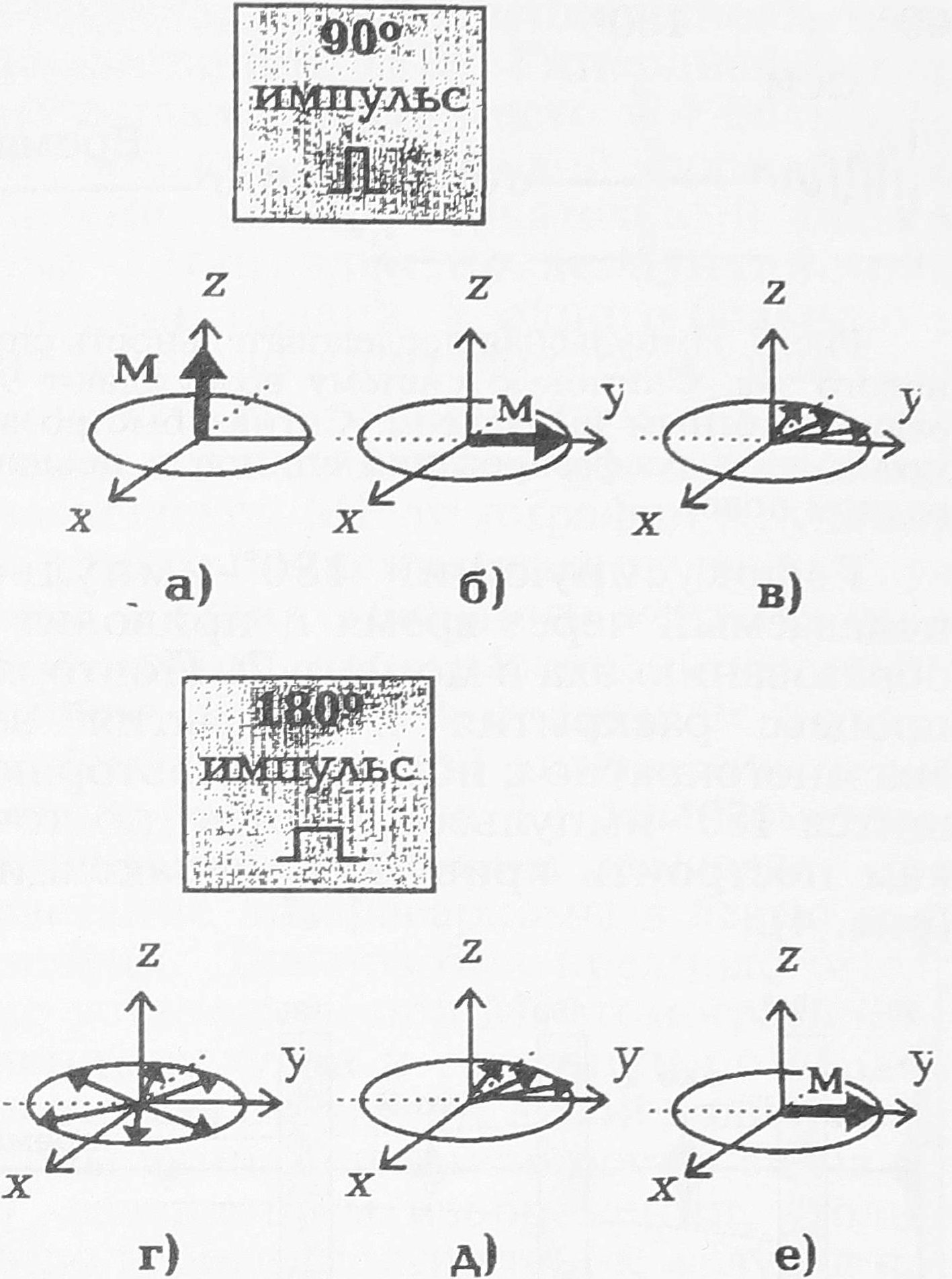 Для получения сигнала ЯМР на спины одновременно воздействуют постоянным магнитным полем и радиочастотным полем, подаваемым в форме кратковременного импульса, при этом вектор суммарной намагниченности М отклоняется от направления магнитного поля.
