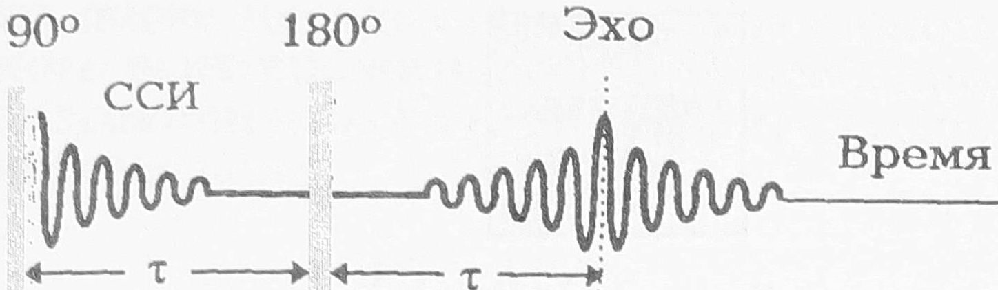 Рис. 3. Импульсная последовательность спинового эха. Спиновую систему возбуждают 90° радиочастотным импульсом. Сигнал быстро затухает из-за расфазирования спинов в неоднородном поле.