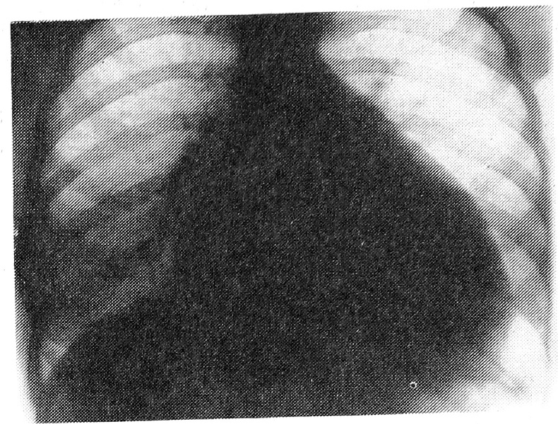 Рентгенограмма: сосудистый рисунок усилен за счет венозного застоя. Легочная артерия и левое предсердие расширены, поперечник сердца увеличен в обе стороны, кардио-торакальный индекс — 65%; определяется очень слабая пульсация дуг левого контура (рис. 2).