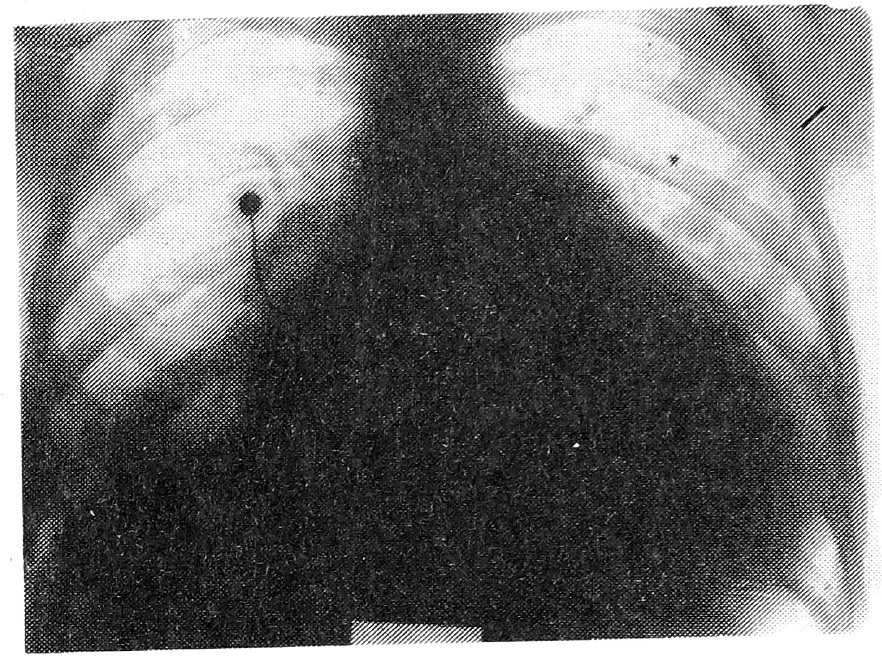 После интенсивного лечения сердечными гликозидами, мочегонными, нитратами состояние больной улучшилось: уменьшилась одышка, сократилась печень, отмечалась положительная ЭХО-кардиографическая динамика. Была выписана 31.08.1989 г. Амбулаторно продолжала принимать сердечные гликозиды и мочегонные. В ноябре после физических и психических перегрузок почувствовала себя хуже: усилилась одышка, появились отеки на ногах. В связи с нарастанием сердечной недостаточности 14.11.1989 г. вновь была госпитализирована в областной кардиодиспансер. Рентгенологически имели место усиление признаков застоя в легких, выпот в правой плевральной полости (рис. 3).