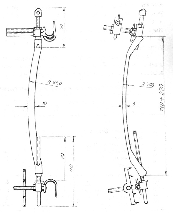 Нами выполнена модификация данного устройства. Пластина изогнута в 2 плоскостях: фронтальной и сагиттальной. Тем самым и действие ее направлено не только на устранение бокового искривления позвоночника, но и на его торсию (рис. 1). Изменена хвостовая часть устройства. Она заменена винтовым механизмом, который обеспечивает дистракцию и создает дополнительное усилие на пластину, увеличивая ее корригирующие свойства. При помощи гайки-упора удерживается достигнутая во время операции коррекция позвоночника. Хвостовая часть выполнена так, что не мешает росту позвоночника. С помощью гайки-упора можно осуществлять дополнительную коррекцию сколиоза спустя 3—4 мес после операции. Устройством Л. Л. Роднянского — В. К. Гупалова это сделать невозможно. При монтаже устройства Л. Л. Роднянского — В. К. Гупалова в грудном отделе применяется гребенка для придания жесткости узлу. Гребенка фиксирует 3—4 позвонка и тем самым препятствует их росту. Монтаж же нашего устройства выполняется на 2 крючках за дужки одного позвонка, что не мешает его росту. Вращение пластины исключается установкой дополнительного крючка с серьгой в нижнем сегменте пластины.