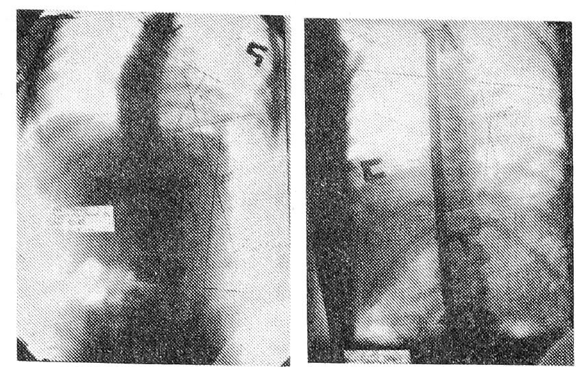 Рис. 2. Рентгенограмма больной Д., 11 лет. с прогрессирующей формой сколиоза: а — до операции, б — после операции.