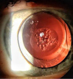 Fig. 2. Patient's left eye, posterior capsulorhexis, rounded. Elschnig cells on the back of the IOL