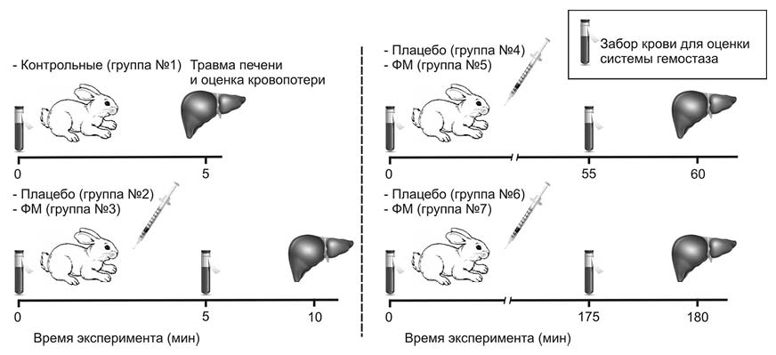 Для исследования системы гемостаза получали кровь из краевой вены уха (самотёком), не используя первые капли. Кровь у животных первой группы забирали за 5 мин до травмы печени; во второй-седьмой группах забор осуществляли дважды: непосредственно перед внутривенным введением плацебо или ФМ, а также через 5 мин (вторая и третья группы), 1 ч (четвёртая и пятая группы) или 3 ч (шестая и седьмая группы) после инъекции плацебо или ФМ — перед нанесением дозированной травмы печени (см. рис. 1).