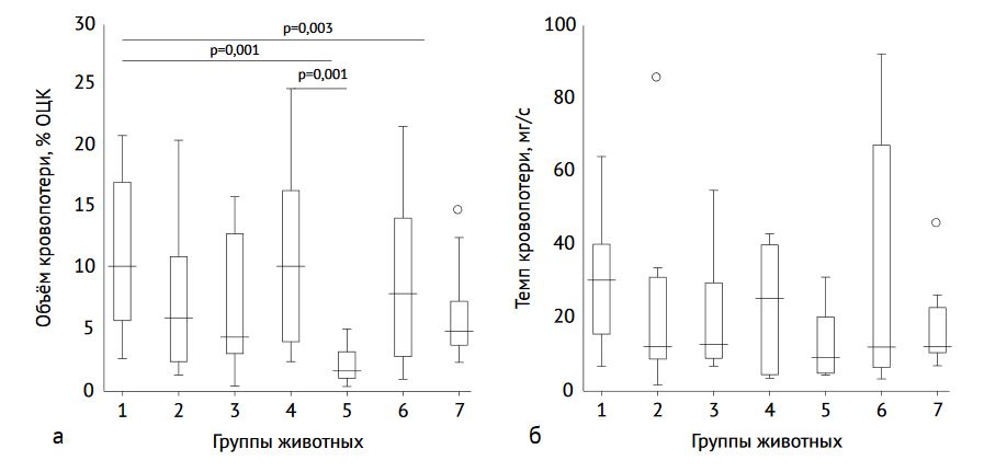 В ходе экспериментов определено, что введение плацебо животным (вторая, четвёртая и шестая группы) до нанесения травмы в разные интервалы времени не оказывает влияния как на объём, так и на темп кровопотери (рис. 2).