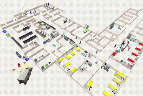 Первоначально создали 3-D модель СтОСМП, которая включала основные объекты, определяющие рабочее место, а также медицинскую переносную технику. Кроме того, на объекте выделены три основные рабочие зоны отделения (красная — палата реанимации и интенсивной терапии; жёлтая — палата динамического наблюдения; зелёная — зал ожидания), согласно существующей дифференцировке пациентов в реальном времени, в зависимости от времени ожидания осмотра врачом, тяжести состояния пациента и объёма выполняемых лечебно-диагностических процедур.
