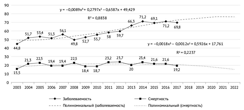 Рис. 1. Динамика грубых показателей заболеваемости и смертности от рака молочной железы у женщин в Удмуртской Республике в 2003–2017 гг. (на 100 тыс. женского населения) с прогнозом до 2022 г.