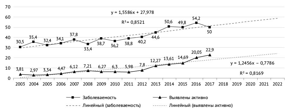 Рис. 2. Динамика заболеваемости раком молочной железы I–II стадии, в том числе и выявленных активно (на 100 тыс. женского населения), за 2003–2017 гг. и прогноз до 2022 г. в Удмуртской Республике