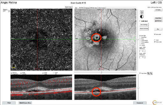 Рис. 1. Данные оптической когерентной томографии и ангиографии левого глаза пациента Т.