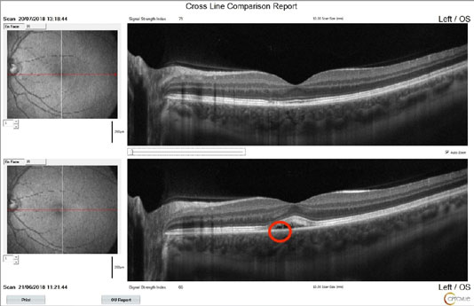 Несмотря на то обстоятельство, что основным методом диагностики ЦСХ служит флюоресцентная ангиография глазного дна, в последнее время появляются работы по корреляции изменений в пигментном эпителии сетчатки, выявленных с помощью оптической когерентной томографии (ОКТ) и флюоресцентной ангиографии глазного дна [4]. Многие специалисты рассматривают флюоресцентную ангиографию как инвазивную, с риском нежелательных явлений, поэтому перед её проведением учитывают ряд противопоказаний, способных усугубить состояние пациента во время или после исследования [5, 6].
