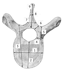 Рис. 1. Схема остеометрии позвонка: 1 — фронтальный размер тела позвонка; 2 — сагиттальный размер тела позвонка; 3 — транспедикулярный размер тела позвонка; 4 — фронтальный размер ножки дуги позвонка; 5 — краниокаудальный размер ножки дуги позвонка; 6 — толщина пластинки дуги позвонка; 7, 8 — фронтальные размеры остистого отростка (7 — на уровне основания отростка, 8 — на уровне его середины); 9 — сагиттальный размер остистого отростка
