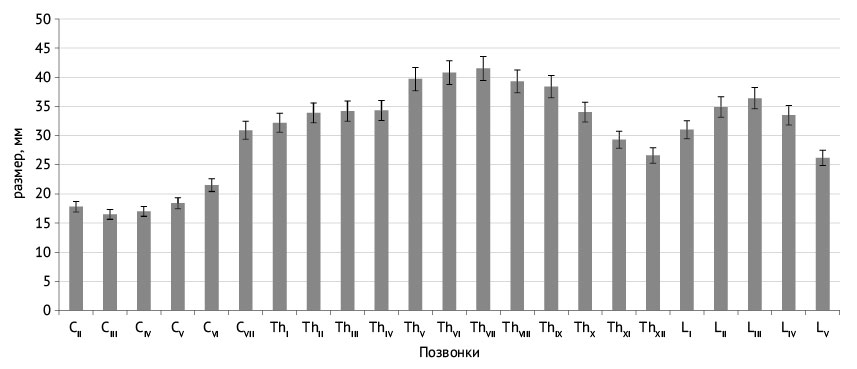 Примечание: *р < 0,05 по сравнению с вышележащим позвонком: для шейного отдела по сравнению с размером СII, грудного — ThI, поясничного — LI.