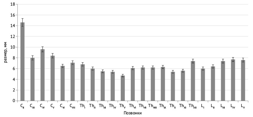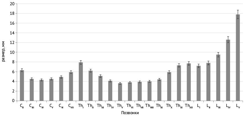 Фронтальный размер тел позвонков увеличивался от II до VII шейного позвонка, затем снижался от I до V и VI грудных позвонков, а начиная с уровня VII грудного позвонка, происходило дальнейшее его увеличение. Сагиттальный размер тела позвонка увеличивался только от II шейного до III поясничного позвонка. Сагиттальный размер тел III–V поясничных позвонков составлял от 32 до 34 мм. На уровнях всех позвонков фронтальные размеры позвоночного канала превышали сагиттальные, за исключением атланта и V грудного позвонка. Данные сагиттальных размеров тел поясничных позвонков и позвоночного канала на этом уровне согласуются с результатами A. Pierro и соавт. [13].