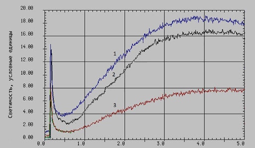 Рис. 3. Запись хемилюминесценции в модельной системе, генерирующей активные формы кислорода, при добавлении 10 мкг бромфенака (3), 45 мкг кеторолака (2); отдельно представлен контроль (1)