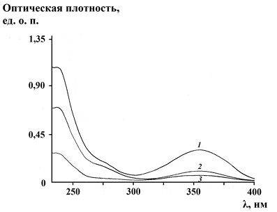 Рис. 1. Спектральные кривые фелодипина в этаноле: 1 — 0,0015% раствор стандартного образца; 2 — раствор вещества, изолированного из плазмы крови; 3 — раствор вещества, изолированного из крови