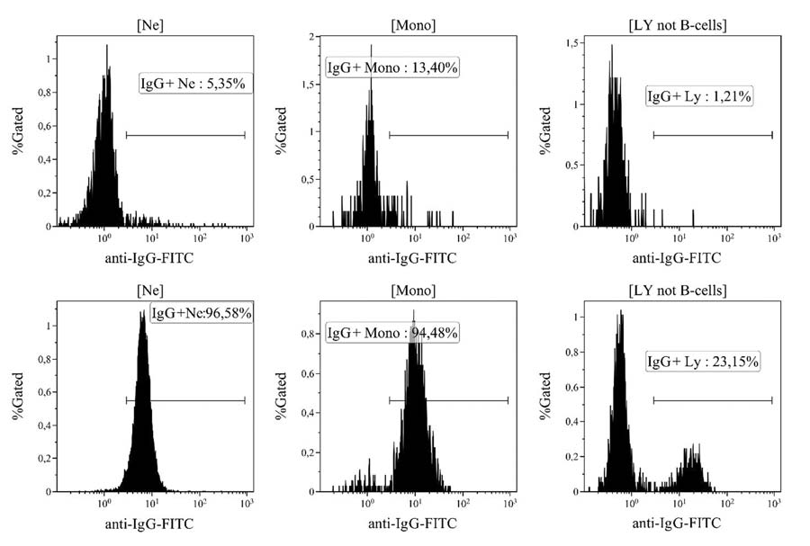 Слева направо на гистограммах приведены результаты взаимодействия анти-IgG аллоантител с нейтрофилами, моноцитами, а также общей популяцией лимфоцитов, состоящей из Т-лимфоцитов и натуральных киллеров, периферической крови. Результат приведён в виде % позитивных клеток в каждой из проанализированных популяций. Область позитивного связывания («IgG+» на соответствующих гистограммах) выставлена на основании образцов, окрашенных только вторыми анти-IgG антителами (фоновое связывание вторых антител).