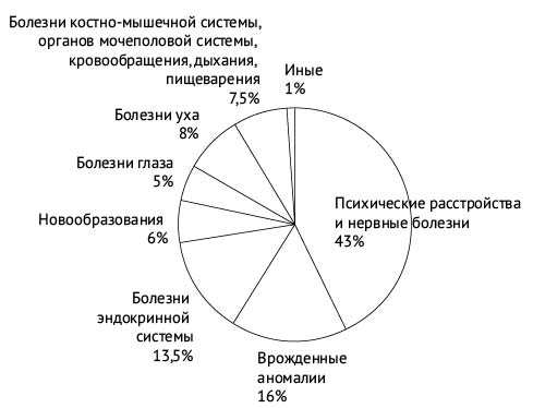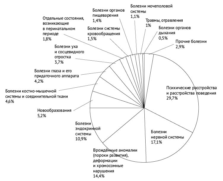 В возрастной структуре первичной инвалидности 10,6% занимают дети от 0 до 3 лет, 23,6% — дети в возрасте от 4 до 7 лет, 45,1% — от 8 до 14 лет, 20,7% — от 15 до 17 лет. У детей 0–17 лет первое ранговое место среди причин, наиболее часто приводящих к первичной инвалидности, стабильно занимают психические расстройства и расстройства поведения. На втором ранговом месте — болезни нервной системы. Третье место занимают врождённые аномалии, деформации и хромосомные нарушения (рис. 1). Статистические показатели по Республике Татарстан аналогичны данным Росстата.