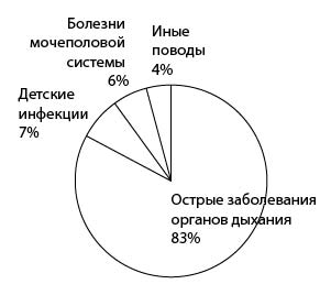 Выявлено, что дети-инвалиды обращаются по различным причинам (рис. 4) за медицинской помощью в 2,3 раза чаще, чем их здоровые сверстники. Среди причин превалируют обращения по поводу заболеваний органов дыхания, реже с инфекционными заболеваниями и болезнями мочеполовой системы. Более 4 раз в год болеют 58% детей-инвалидов.