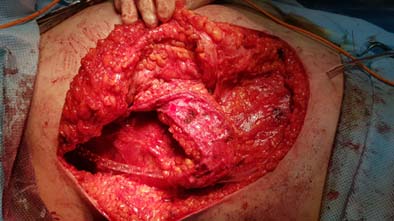 Рис. 5. Выкроенный деэпидермизированный LТAP-лоскут. Ложе опухоли клипировано титановыми клипсами для подведения буста