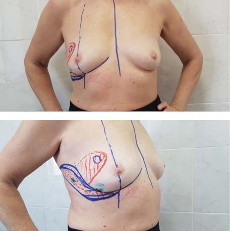 Клинический пример №1. Больная Ж. 46 лет, рак правой молочной железы, рT1bN0M0, люминальный А, BRCA1 и BRCA2 отрицательный, CHEK2 отрицательный, стадия I, клиническая группа 2. Расположение опухоли в верхнем наружном квадранте, размер опухоли 0,8 см, исходное состояние молочных желёз, желание пациентки выполнить органосохраняющее лечение и отказ от использования силиконовых эндопротезов обусловили выбор методики операции. Разметка возможных к использованию перфорантов произведена при УЗИ с допплеровским картированием по вышеописанной методике. Вид больной до операции представлен на рис. 1.