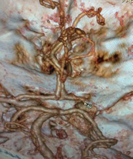 Рис. 2. Компьютерная томографическая ангиограмма головного мозга. Тромбоз правой средней мозговой артерии, сегмент М1
