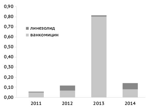 Произошло увеличение потребления антибактериального средства группы гликопептидов ванкомицина с 0,05 до 0,08 УСД/100 койко-дней, с высоким уровнем потребления в 2013 г. — 0,8 УСД/100 койко-дней (рис. 3). Расходы ни его закупку также возросли — с 0,52 до 2,18% всех расходов на антибиотики. Потребление линезолида возросло в 6 раз — с 0,009 УСД/100 койко-дней в 2011 г. до 0,056 УСД/100 койко-дней в 2014 г. (см. рис. 3). Затраты на его закупку возросли в 3 раза — с 1,38 до 4,1% всех расходов на антибиотики.