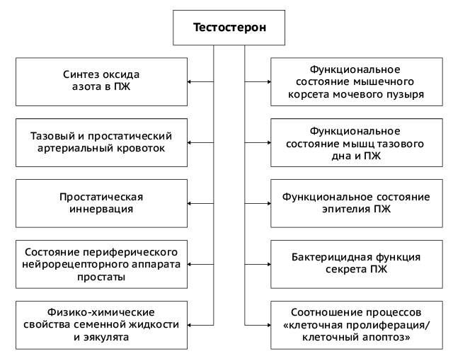 ПЖ представляет собой иммунокомпетентный орган, в метаболизме которого решающую роль играет «король гормонов» — тестостерон (Т). Это основной и наиболее важный циркулирующий андроген — стероидный гормон, который контролирует развитие и сохранение мужских половых признаков. За биосинтез и секрецию Т отвечает непосредственно центральная нервная система, по принципу отрицательной обратной связи происходит синтез гипоталамусом гонадотропин-рилизинг гормона, который в свою очередь влияет на переднюю долю гипофиза, секретирующую в ответ на это гонадолиберины — лютеинизирующий и фолликулостимулирующий гормоны, воздействующие на клетки Лейдига и Сертоли яичек [14]. Под действием лютеинизирующего гормона в клетках Лейдига происходит более 95% синтеза Т (остальное продуцируется надпочечниками), а под действием фолликулостимулирующего гормона в клетках Сертоли происходит сперматогенез [14].