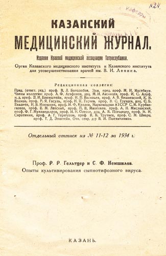 Круг научных интересов Р.Р. Гельтцера не ограничивался только спирохетами, о чём свидетельствуют его работы «Опыты культивирования сыпнотифозного вируса» (1935), «Этиология и бактериологическая диагностика инфекционной желтухи» (1939). В этот период профессор Р.Р. Гельтцер возглавлял кафедру микробиологии и был научным консультантом Краевого микробиологического института Наркомздрава ТАССР, а Семён Федосеевич Немшилов был его директором.
