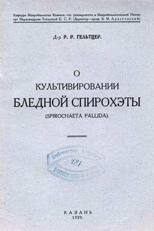 12. Гельтцер Р.Р. О культивировании бледной спирохеты. Отдельный оттиск из «Учёных записок Казанского гос. университета им. В.И. Ульянова-Ленина». 1929; XXXIX (1): 107 с.