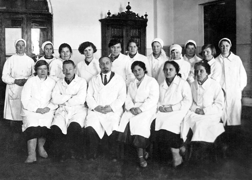 Рис. 7. Кафедра микробиологии Казанского медицинского института. 1939 г. Р.Р. Гельтцер (нижний ряд, четвёртый слева) и сотрудники (З.Х. Каримова, Е.К. Наумова, Н.С. Фазлуллин и др.)