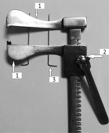 Рис. 1. Общий вид одного из вариантов аппарата для сопоставления краёв операционной раны: 1 — бранши; 2 — винтовой механизм; 3 — направляющие спицы. Пояснение в тексте