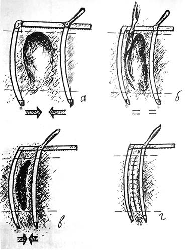 Рис. 2. Схематичное изображение последовательности этапов удаления опухоли поверхностных тканей: а — дозированное сдавление; б — радикальное иссечение; в — сближение краёв раны; г — наложение швов. Пояснение в тексте