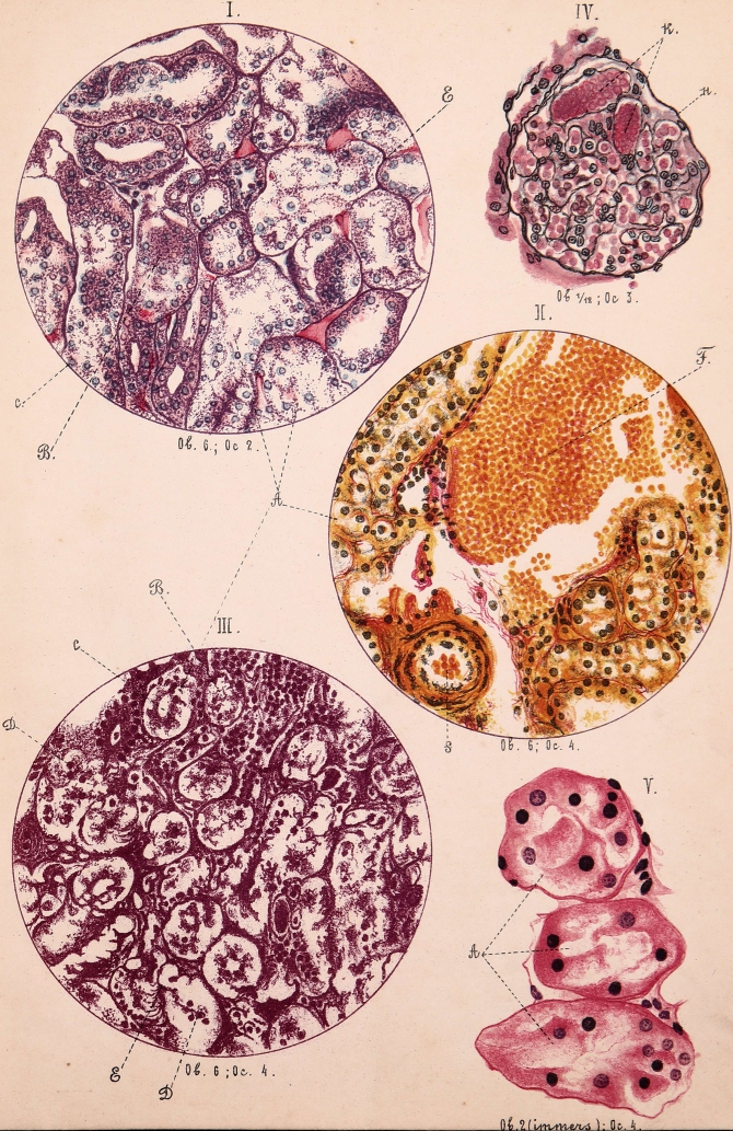 Въ нѣкоторыхъ прямыхъ и витыхъ канальцахъ сильно измѣненный эпителій весь или только отчасти отошелъ отъ membrana propria и сосредоточился въ центрѣ канальцевъ въ видѣ массъ, самой разнообразной формы (рис. I и III—В.).