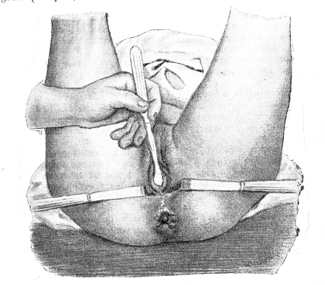 Разрѣзаны продольнымъ разрѣзомъ hymen, задняя стѣнка вагины и промежность. Послойными разрѣзами дошли до прямой кишки. Кишка тупымъ путемъ и рѣжущими инструментами выдѣлена изъ параректальной клѣтчатки и выше опухоли взята по бокамъ на 2 толстыя шелковыя провизорныя лигатуры.