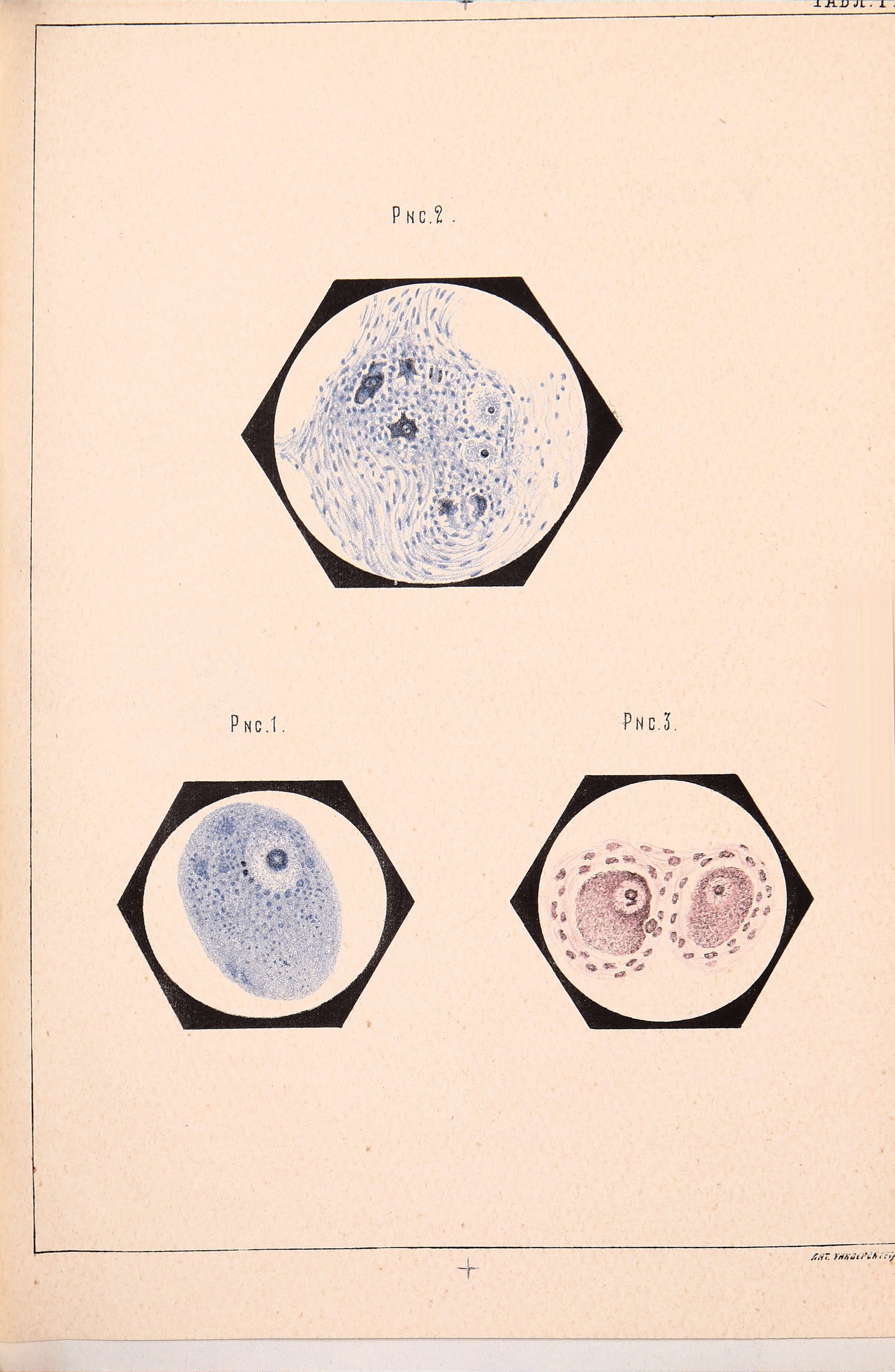 Хроматофилы представлялись въ видѣ крупныхъ глыбъ, располагались въ одинъ или два ряда широкимъ кольцомъ у самой периферіи клѣтки. Между глыбами хромофиловъ въ периферіи клѣтки, а также и ближе къ центру попадались многочисленныя, различной величины, правильно круглой формы, вакуоли. Вокругъ ядра и въ среднемъ поясѣ клѣтокъ находилась мелкозернистая и бледно-крашенная протоплазма безъ всякаго слѣда хромофиловъ. Основное вещество клѣтокъ красилось въ блѣдпо-голубой цвѣтъ. Ядра лежали нѣкоторые въ цѣнтрѣ клѣтокъ, нѣкоторые эксцентрично, гдѣ было наименьшее количество хромофиловъ, имѣли довольно часто до 4-хъ ядрышковъ, лежащихъ въ основномъ гомогенномъ веществѣ ядра. Приходилось изслѣдователю наблюдать и болѣе рѣзкое перемѣщеніе ядра къ самой периферіи клѣтки, при одновременномъ скучиваніи хромофиловъ въ противѵположпомъ полюсѣ, придавая своеобразный видъ такой клѣткѣ. Клѣтка состояла изъ двухъ половинъ, одной блѣдно окрашенной и содержащей ядро, другой интензивно окрашенной отъ скопленія хромофиловъ. Ядра вь этихъ случаяхъ были зазубрены по краю, или же контуры ихъ исчезли и на присутствіе ядра указывали только ядрышки.