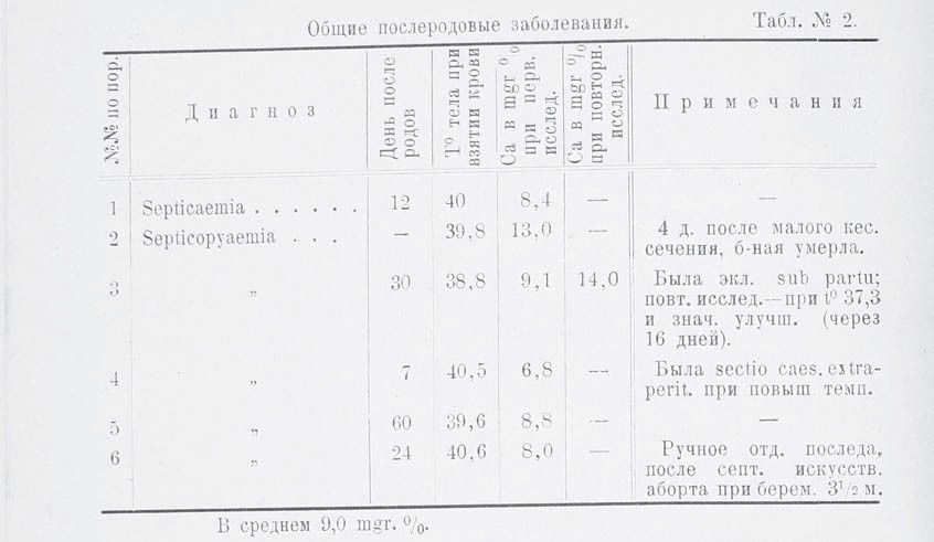 В таблицах 2 и 3 показано содержание Са в сыворотке послеродовых больных при заболеваниях крови (табл. № 2) и различных местных осложнениях (табл. № 3). Дифференцировать эти случаи на большее количество групп, как это делают Д и б о б е с и Кватер, мы не видим достаточных оснований и полагаем, что этот путь может только привести к запутанным представлениям.