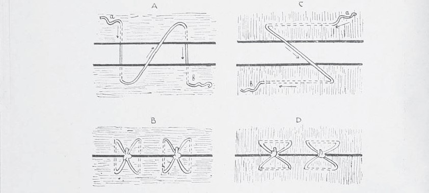 Уже несколько лет мною применяется для сшивания тканей крестообразный шов, соединяющий в себе положительные качества того и другого вместе. Особенно он превосходен при сшивании краев апоневроза, с большим усилием сближаемых .друг с другом, как это бывает иногда при лапаротомиях; в последнем случае при (применении крестообразного шва не бывает прорезывания нитками захваченных краев апоневроза, несмотря на сильное натяжение. В этом заключается самое главное достоинство данного шва. Кроме того, при применении указанного шва. достигается хорошее сближение соединяемых краев апоневроза, герметичность участков, где наложены швы, и, наконец последнее качество-это экономия во времени.