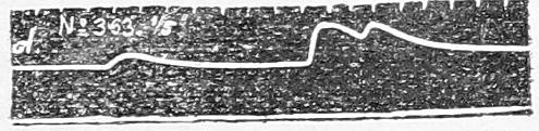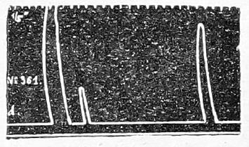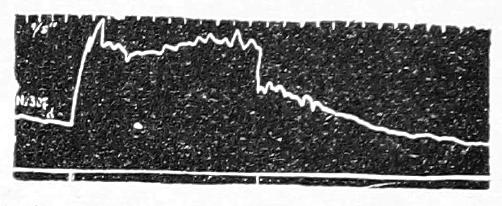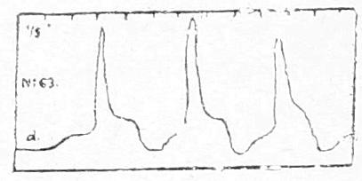 Все эти мышечные сокращения не были однообразны по своей силе, не были ритмичны. Для их характеристики привожу запись гиперкинеза m. bicipitis dext. в форме клонических судорог у больного 25 лет. Запись была сделана путем наложения на эту мышцу воспринимающей капсулы, фиксированной неподвижной поперечной повязкой (рис. 1). На этой кривой мы видим острые под’емы и падения в виде вершин различной высоты, отделенных друг от друга различными промежутками времени.
