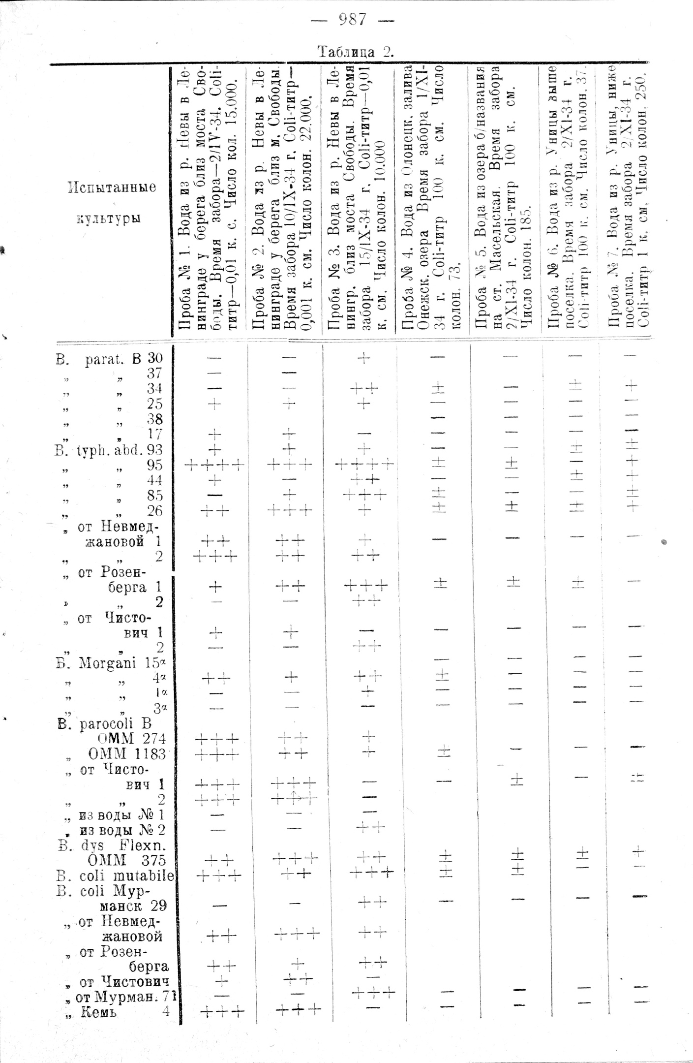 Сравнивая таблицы 1 и 2, мы имеем заметный параллелизм между литическим действием фильтратов, полученных из посевов испражнений брюшно-тифозных больных и реконвалесцентов и полученных из посевов загрязненной невской воды.