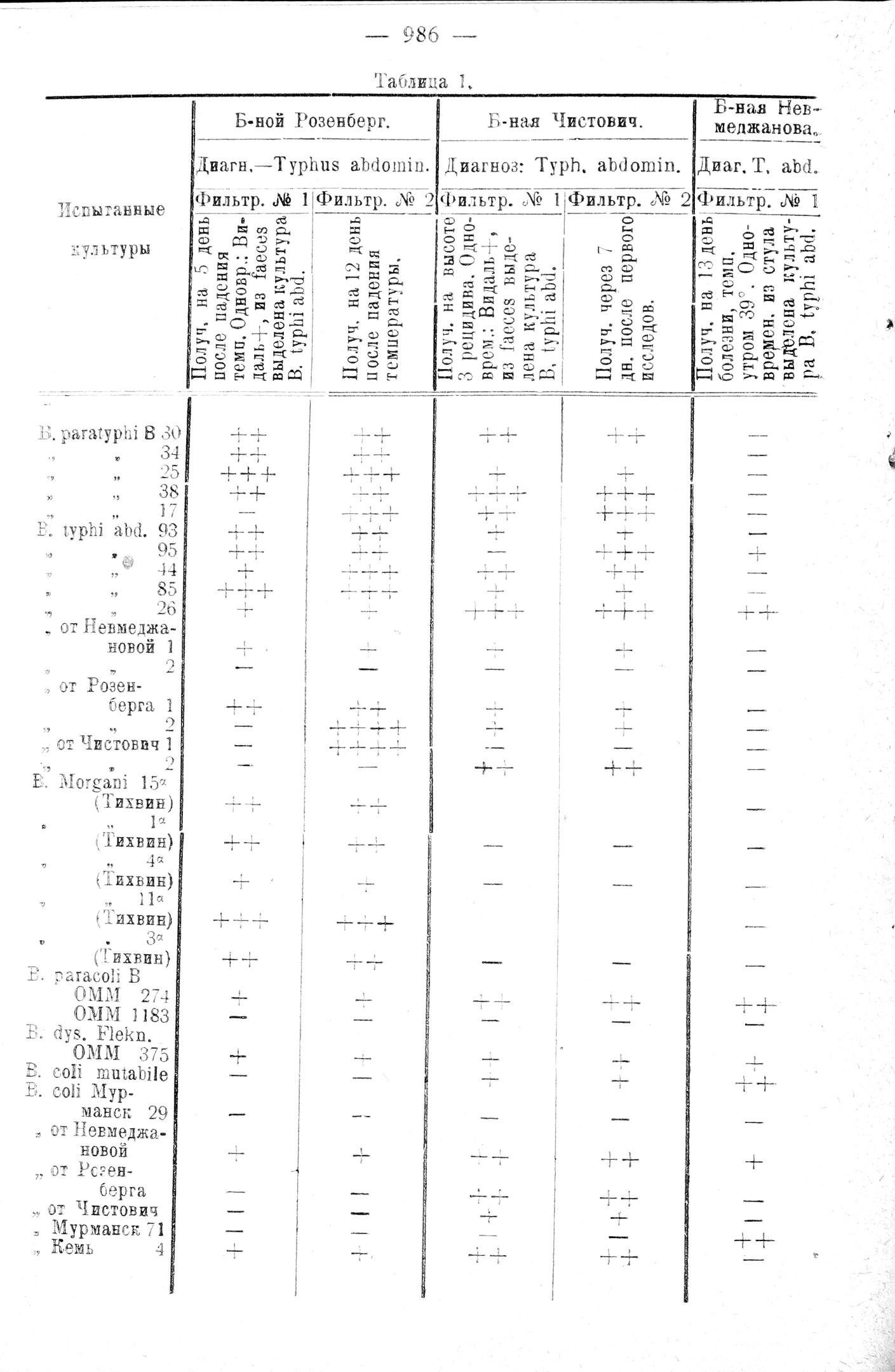 При повторном исследовании faeces этой же больной, через 7 дней после первого исследования, обнаруживается лишь незначительное увеличение активности бактериофага к тифозно-паратифозным микробам. Наконец, реконвалесцента (больной Розенберг) на пятый день после падения температуры мы наблюдаем отчетливое действие фильтрата против почти всех исследованных штаммов В. typhi abdominalis и В. paratyphi В при чрезвычайно слабом действии на штаммы В. соіі.