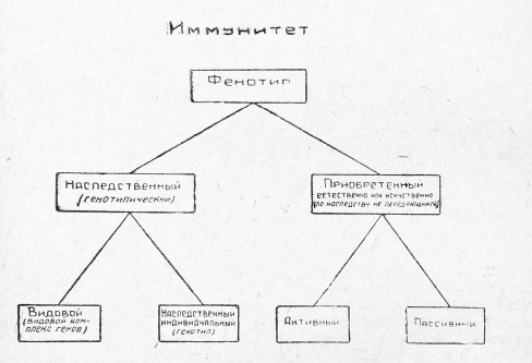При составлении своей схемы я прежде всего руководствовался теми соображениями, что и при анализе явлений иммунитета в реальной действительности мы всегда имеем дело с конкретным случаем иммунологического состояния отдельного индивидуума, т. е. фенотипа. В соответствии с этим, компоненты его иммунологического состояния, синтезированные в фенотипе, могут быть разбиты на наследственные и приобретенные в соответствии с тем, как это принято делать в биологии при анализе признаков фенотипа.
