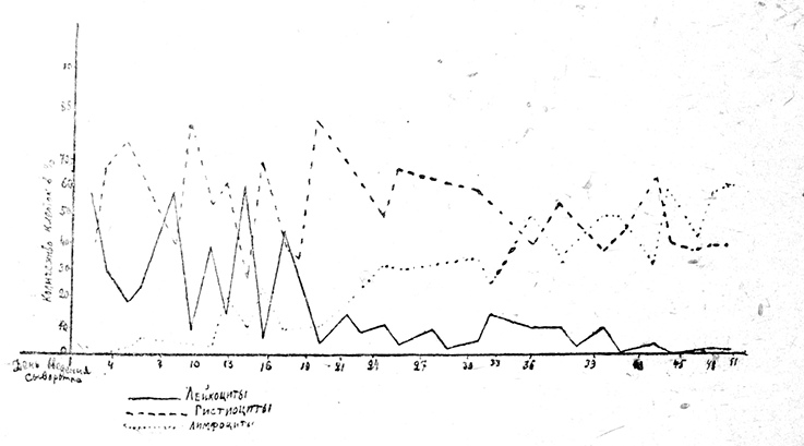 Лимфоцитарная реакция резко отличается от течения обеих предыдущих. Будучи незначительно выражена в первые дни опыта (в пределах 5% общего к-ва клеток эксудата), после 4—5 инъекций она начинает заметно повышаться. Это увеличение числа лимфоцитов мы наблюдаем в течение всего опыта, особенно начиная с 8—9-й инъекции, и достигает к концу наблюдения 55—60%.