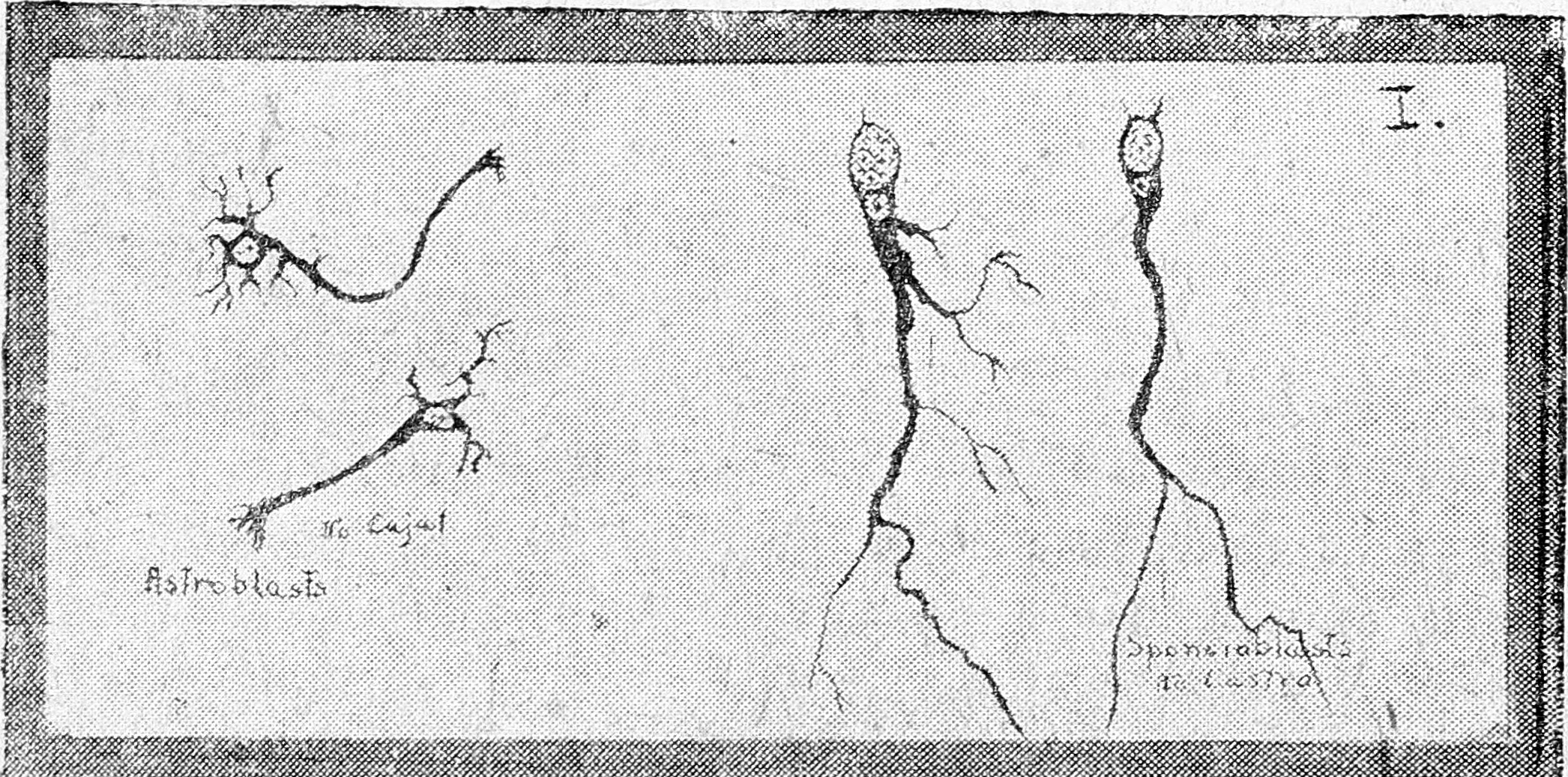 когда часть нерва остается относительно-нормальной, постепенный переход астроцитов в клетки опухоли констатировать легко. По мере приближения к главному телу опухоли клетки эти становятся все более и более атипичными до тех пор, пока они не потеряют всякое сходство с астроцитами. Они становятся удлиненными и часто обнаруживают тенденцию располагаться радиально к. соединительнотканной перегородке и кровеносным сосудам,—другими словами, они принимают более или менее характер спонгиобластов. Если мы примем, впрочем, что клетки опухоли диференцируются в такой же последовательности, как и нормальные клетки по мере эмбриологического развития, то эти клетки не могут быть рассматриваемы как снонгиобласты.