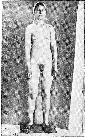 Как видно из прилагаемых фотографий, больная по внешнему виду—женщина. Грудные железы выражены не в достаточной степени.